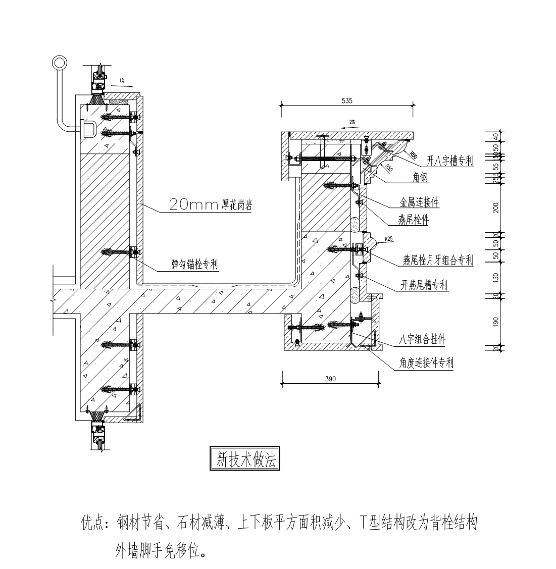 1.植筋與八字背槽式、燕尾栓月牙組合掛件掛貼結(jié)構(gòu)受力合理,連接簡單、可靠,無任何附加應(yīng)力產(chǎn)生。
